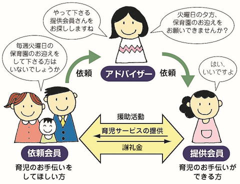 ファミリー・サポート・センターは、育児のお手伝いをしてほしい方(依頼会員)と、できる方(提供会員)を結びつけ、地域での助け合いを進める援助活動です。